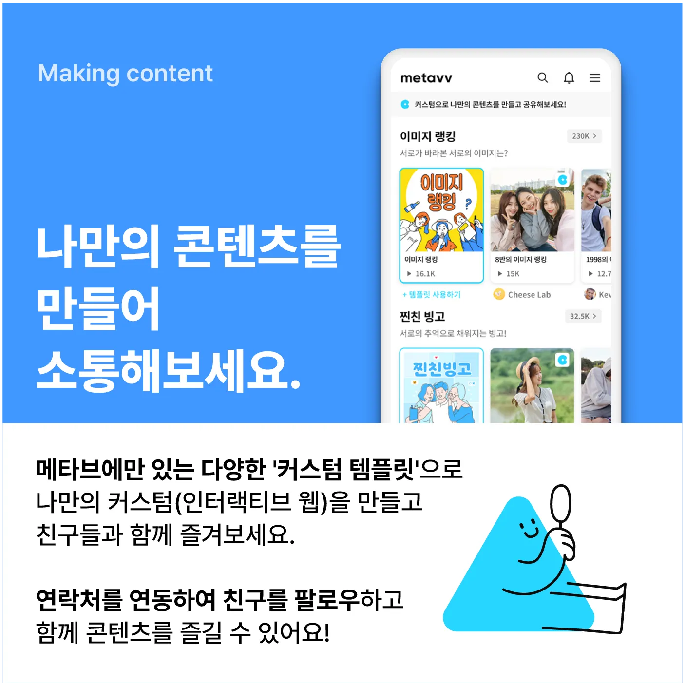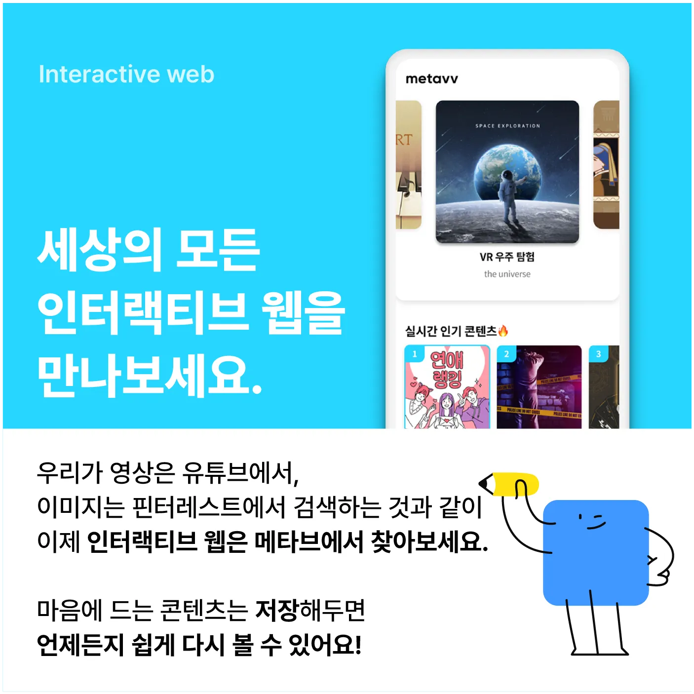 메타브는 '인터랙티브 웹' 콘텐츠를 즐기고, 공유하고, 만들 수 있는 인터랙티브 웹 플랫폼입니다.