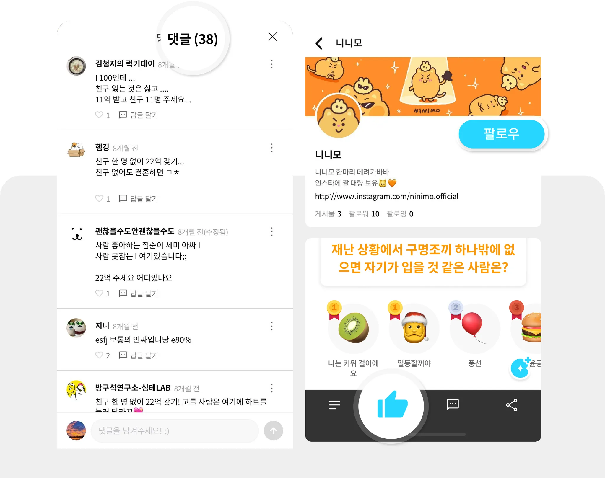 좋아요/댓글/팔로우 기능으로 소통하고, 즐기세요.