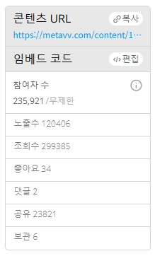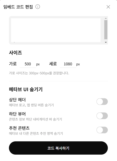 임베드 코드 편집에서 콘텐츠의 사이즈를 조절하고, 상단 헤더, 하단 뷰어, 추천 콘텐츠를 ON/OFF 할 수 있습니다.