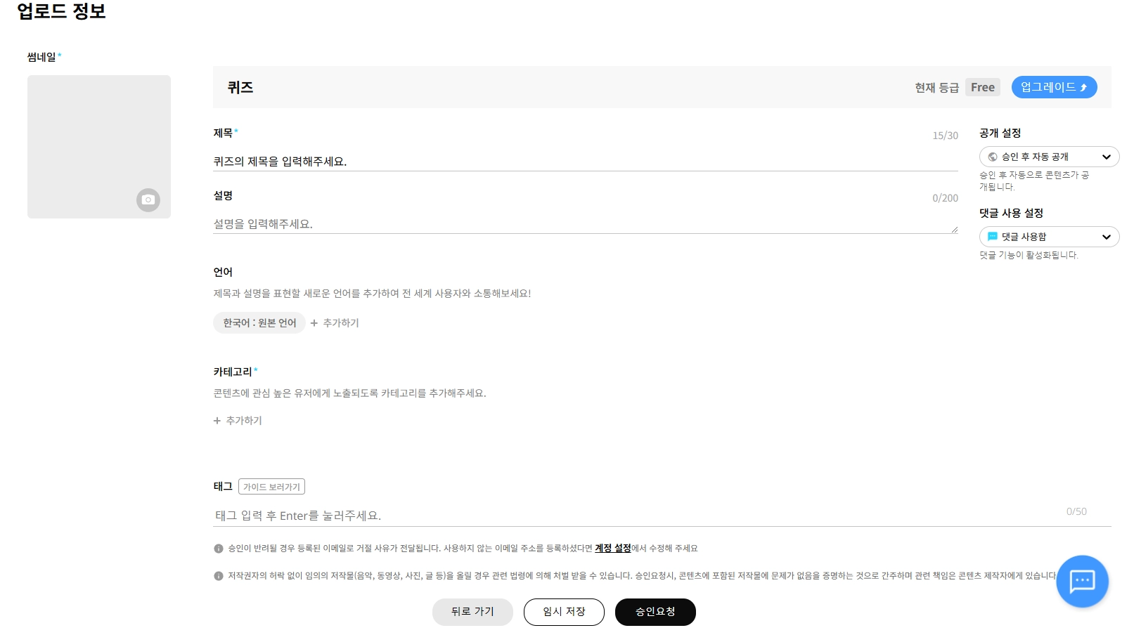 업로드 정보를 모두 설정했다면, ‘승인 요청’ 버튼을 누르면 콘텐츠 심사가 진행됩니다.