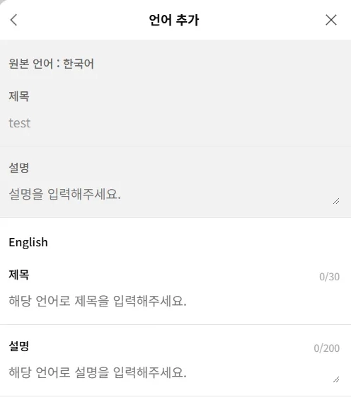 추가한 언어로 제목과 설명을 입력해주면, 해당 언어의 제목과 설명도 등록할 수 있습니다.