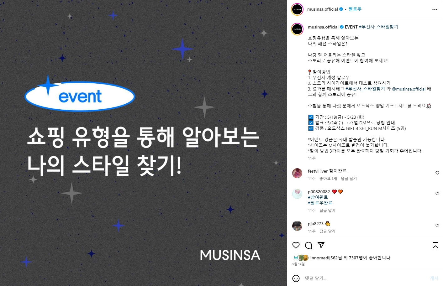 인스타그램 피드에 노출하면서 무신사 태그 이벤트도 함께 진행했는데, 팔로워도 늘고 기존 팔로워들에게 무신사에서 이런 콘텐츠도 발행하고 있다는 인지도 줄 수 있었습니다.