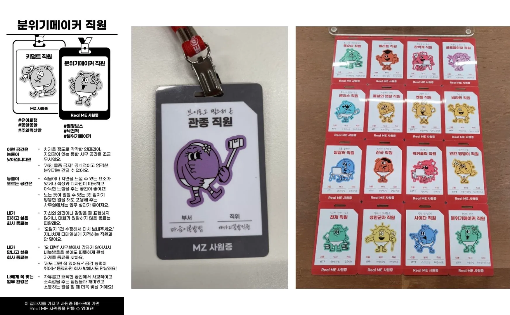 팝업스토어에 오시면 가장 먼저 <리얼미 테스트>를 진행할 수 있도록 부스를 구성했어요. 오신 모든 분이 <리얼미 테스트>를 참여해 주셨고, 특히 실물 사원증에 대한 반응이 좋아 뿌듯하더라고요. (웃음)