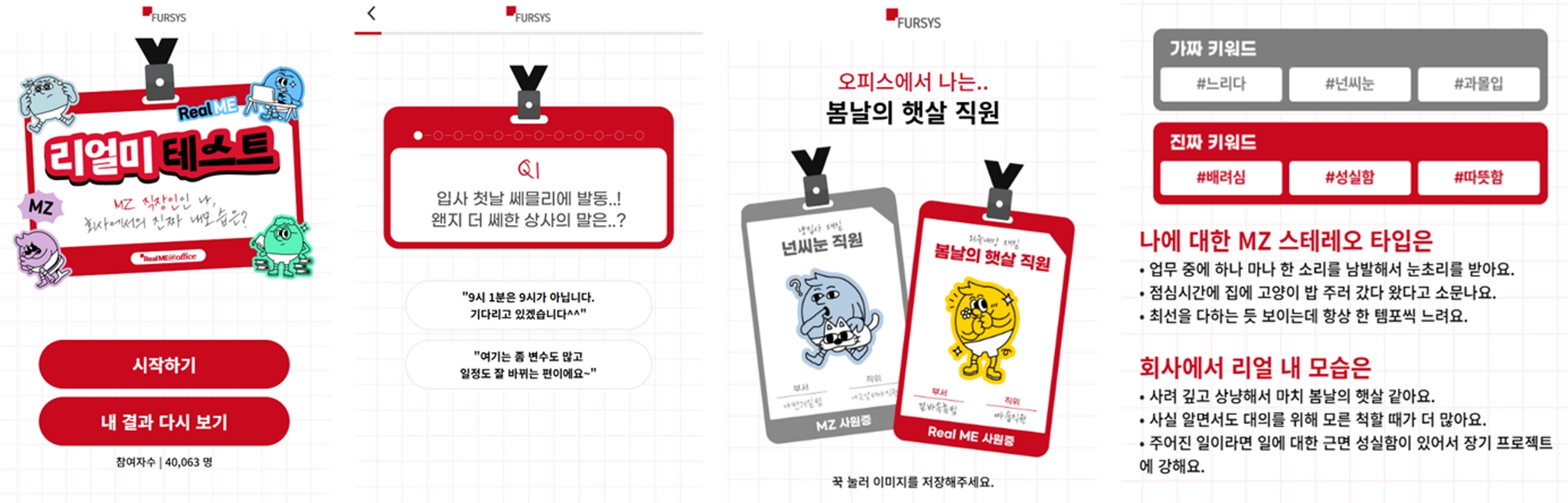 직접 사원증을 목에 걸고 다니시면서 진짜 회사처럼 몰입해 주시는 분들도 많았어요. 테스트를 진행할 때도, 각 질문에 대해 회사에서의 상황들을 진지하게 고민해 주시면서 응해주셨고, 테스트 결과로 동료나 친구분들과 이야기를 나누면서 공감해 주시고 즐거워해 주시는 모습들이 기억에 남네요.