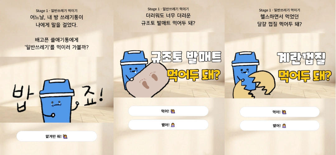 저희가 만든 ‘쓸애기통’ 캐릭터가 특히 인기가 많았어요. 쓰레기통 캐릭터가 쓰레기를 먹거나 뱉는 과정을 통해 환경에 대한 흥미를 유도했습니다.