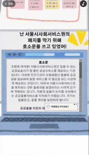 이런 생각을 바꾸고 싶어서, 최근 있었던 서울시 사회서비스원 해산 사건을 게임 속에 녹여냈어요. 딱딱한 캠페인보다는 온라인 게임으로 흥미를 유발하고, 조금 더 부드러운 방법으로 공공 돌봄의 중요성을 알리고 싶었거든요.