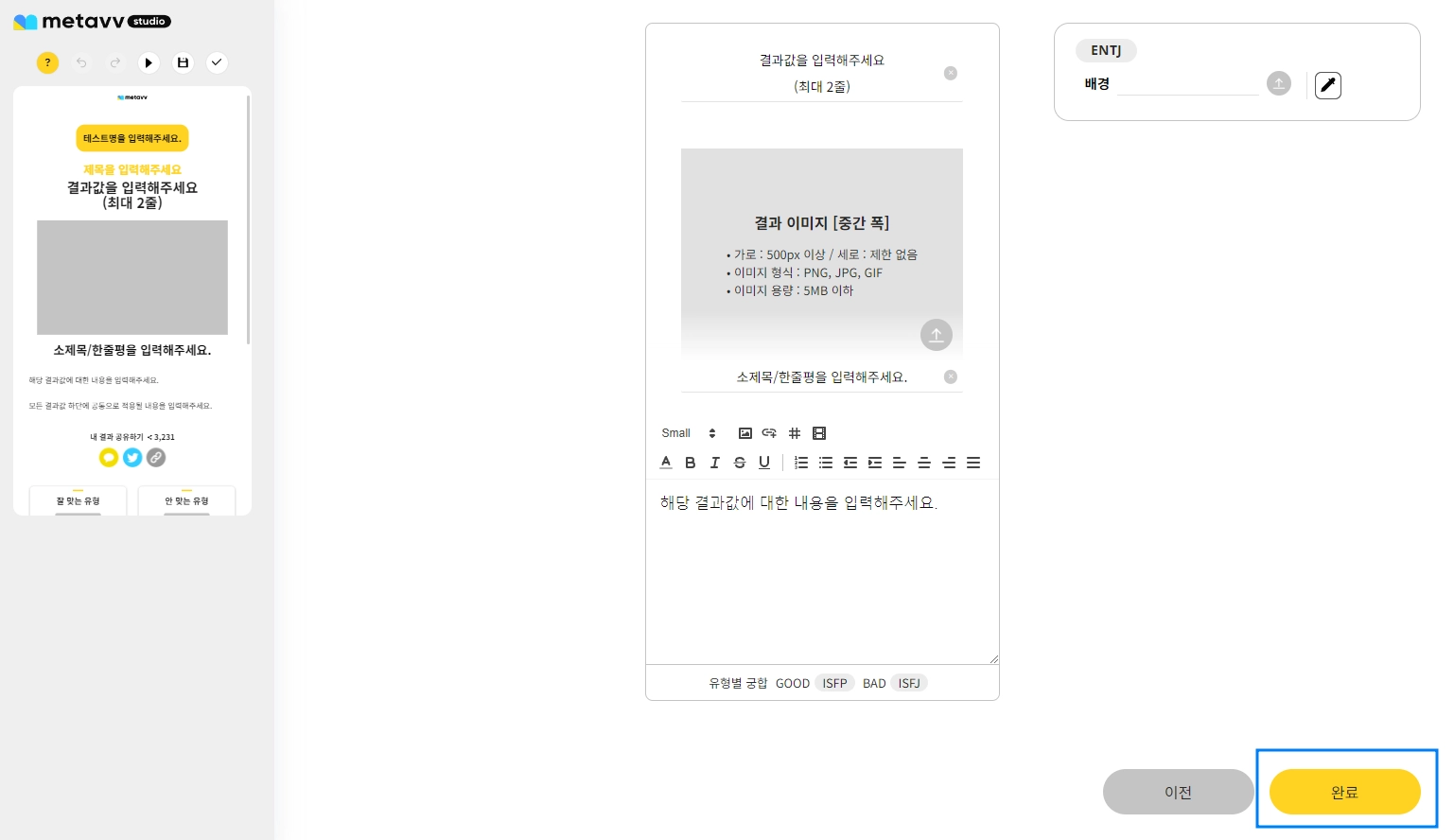 모든 세팅을 끝낸 뒤, 마지막으로 제작 완료 버튼을 누르면 유형 테스트 제작 완료!