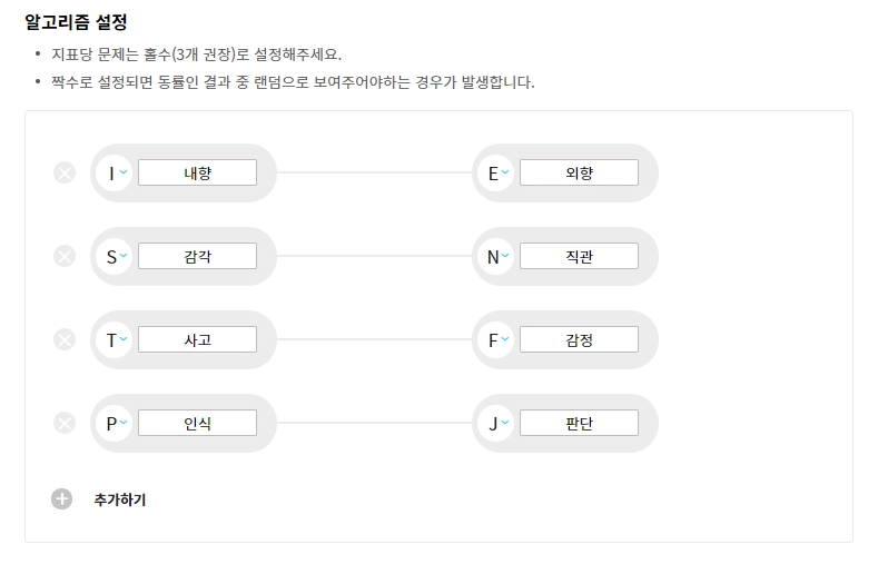 한 지표에는 반대되는 두 성향을 세팅하는 것이 좋아요. (ex. 내향-외향)