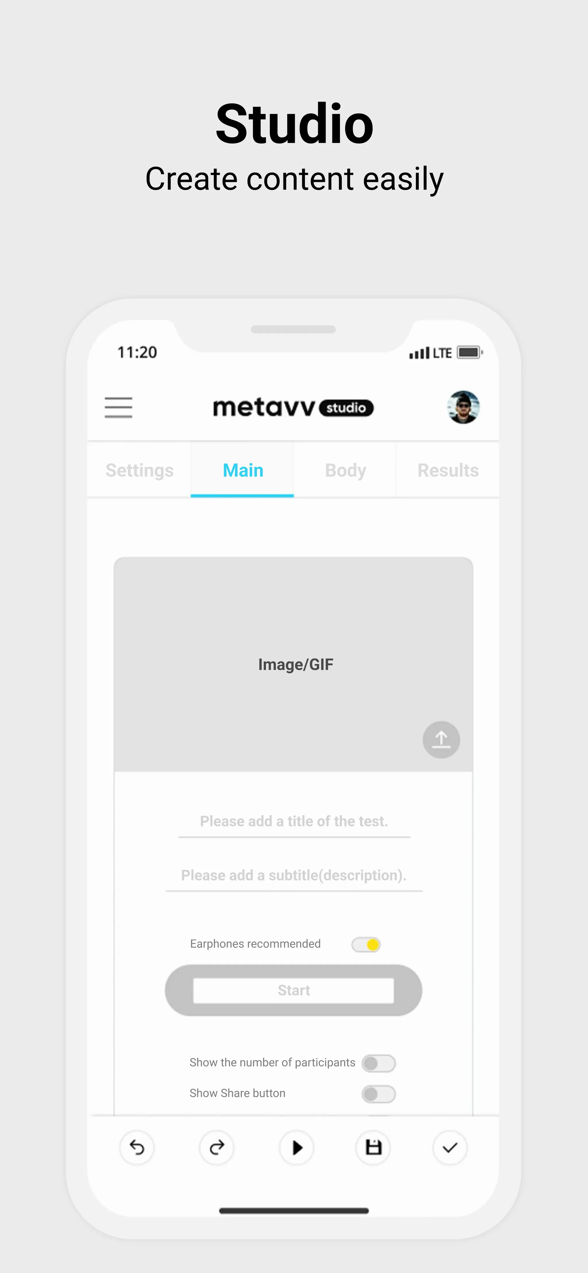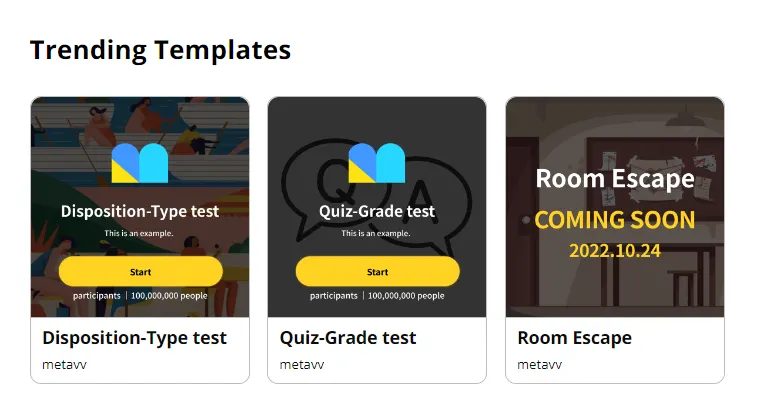 On metavv studio, we make it easy for you to create your own original web content by providing easy-to use templates such as Disposition-Type test, Quiz-Grade test and Room Escape.