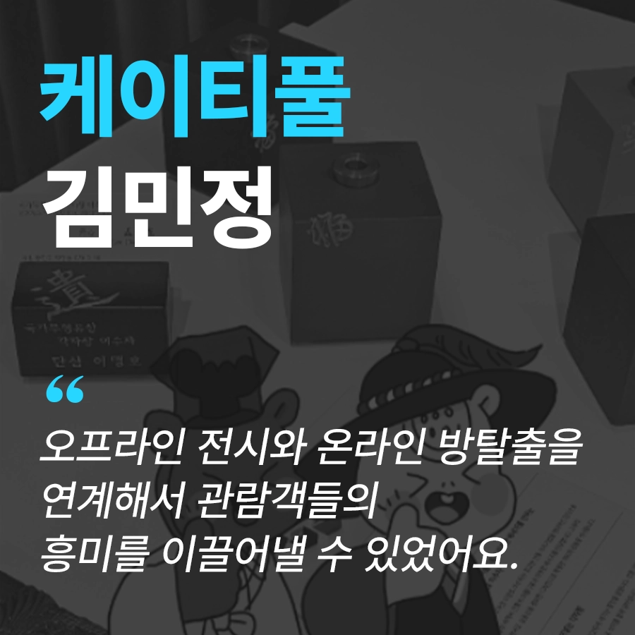 온라인 방탈출 콘텐츠를 오프라인 전시와 함께 활용하여, 관람객들의 흥미를 이끌어내고 무형유산에 더욱더 관심을 가질 수 있도록 도우셨다는 것이 인상적이었습니다.