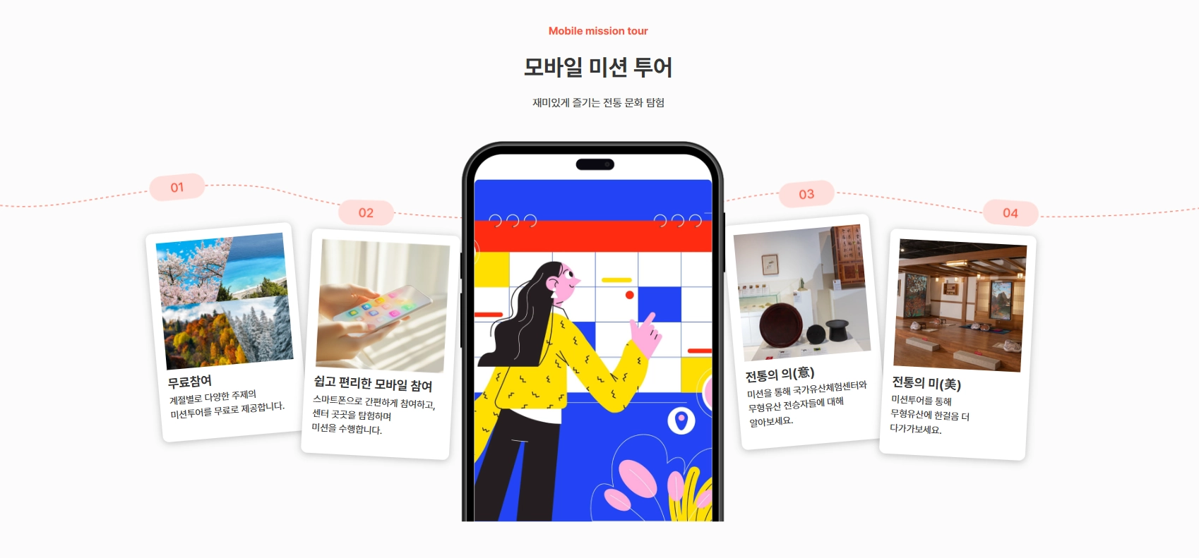 케이티풀에서는 무형유산을 널리 알리고 소개하기 위해 국가유산 체험센터를 운영하고 있어요. 국가유산 체험센터에서, 오프라인 전시와 연계하여 관람객들이 ‘모바일 미션 투어’를 진행할 수 있도록 온라인 방탈출 콘텐츠를 제작했습니다.