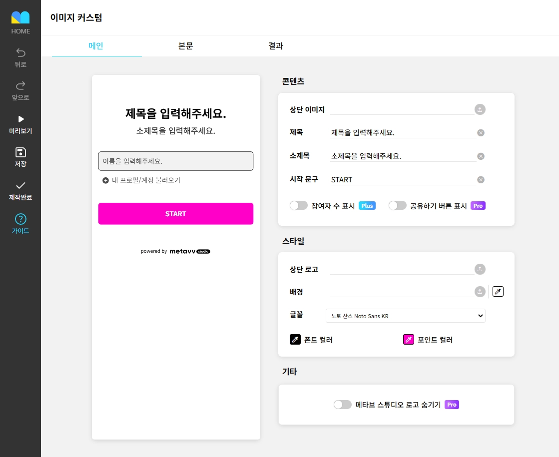 ④ 미리보기 : 참여자처럼 직접 순서대로 플레이할 수 있습니다. 단, 메타브에 같은 계정으로 로그인 되어있어야만, 정상적으로 작동됩니다.