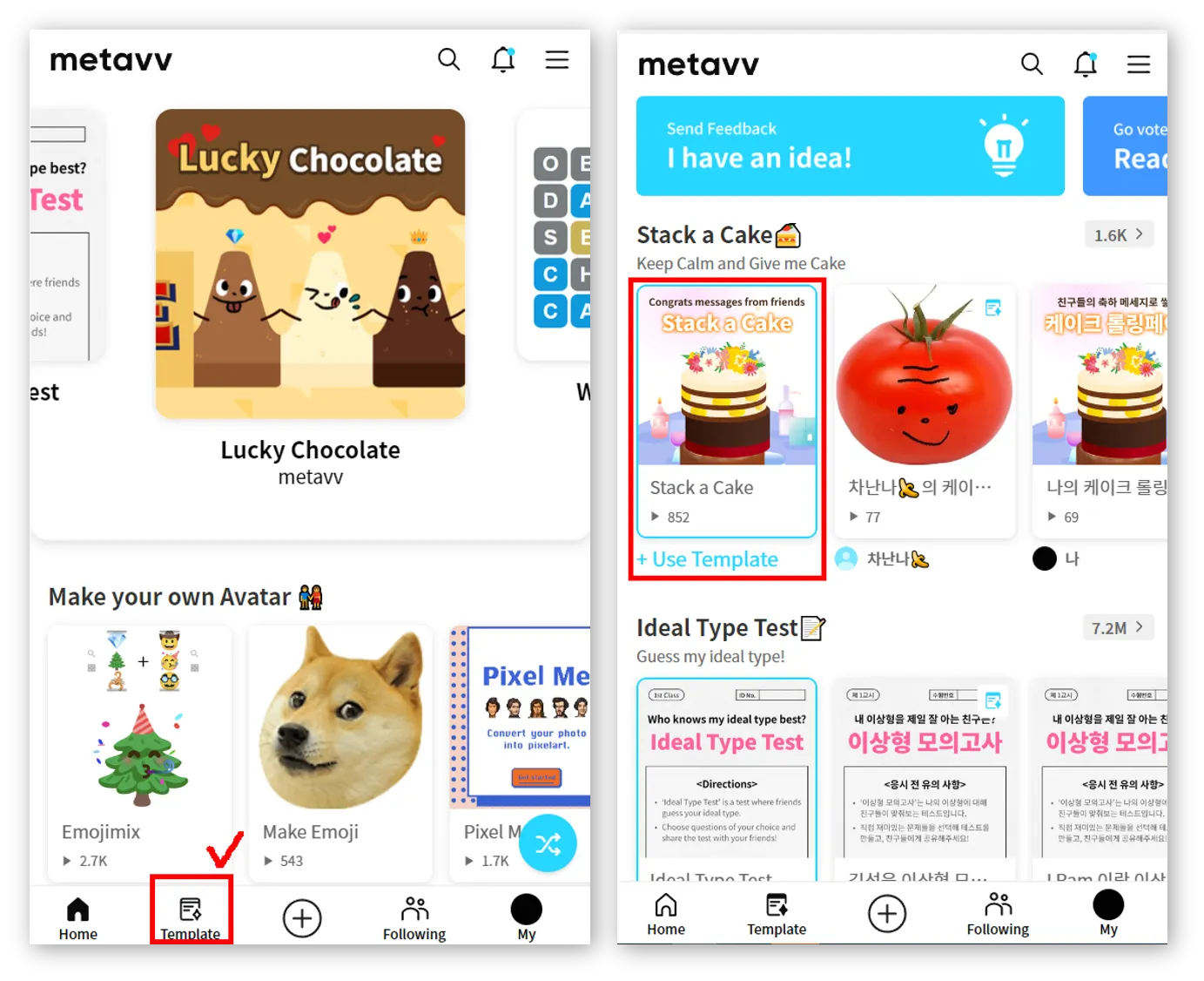 metavv app > Templates tab > select <Stack a Cake> template