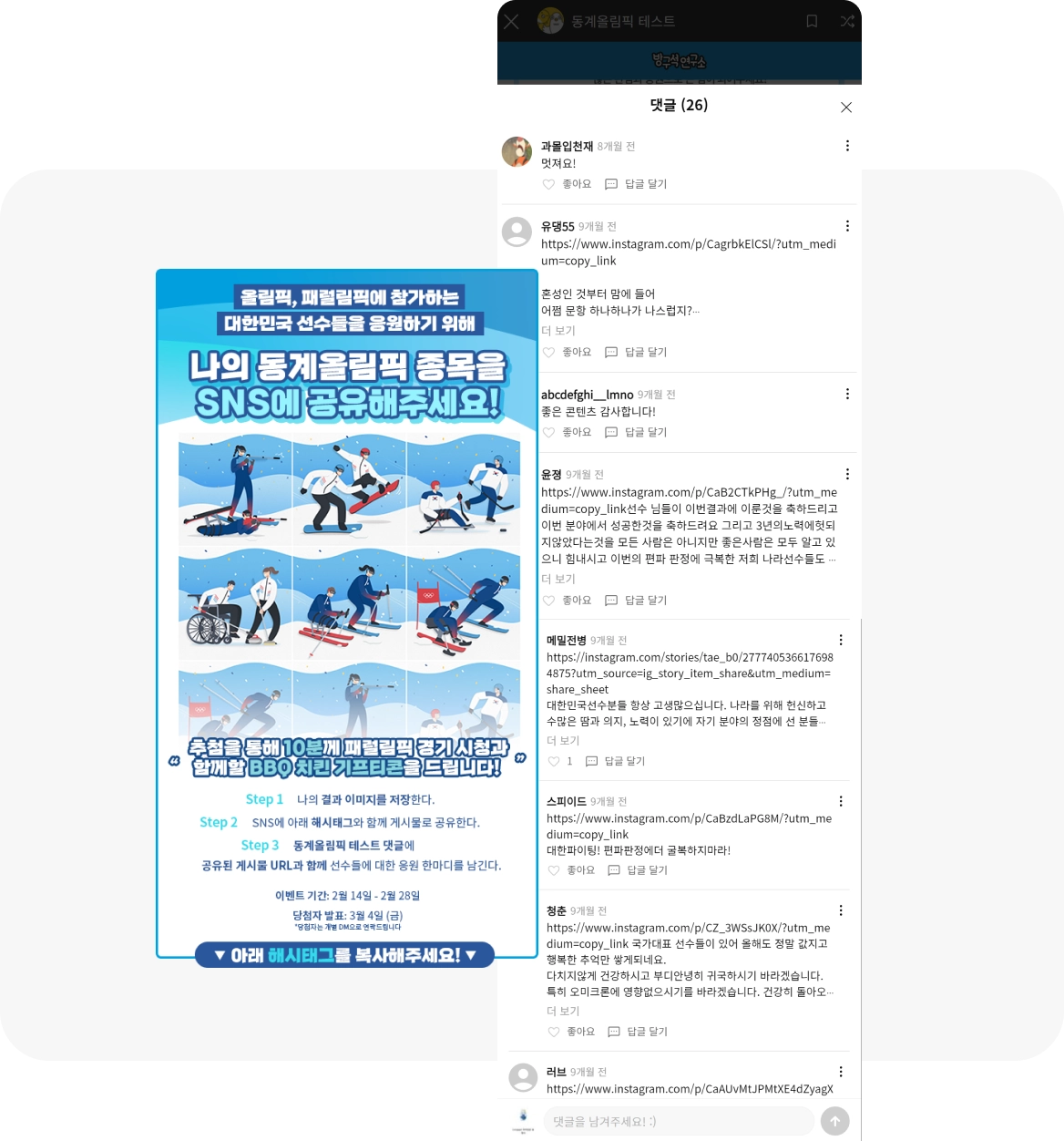 동계올림픽 테스트처럼 댓글 이벤트를 진행해볼 수 있어요.
