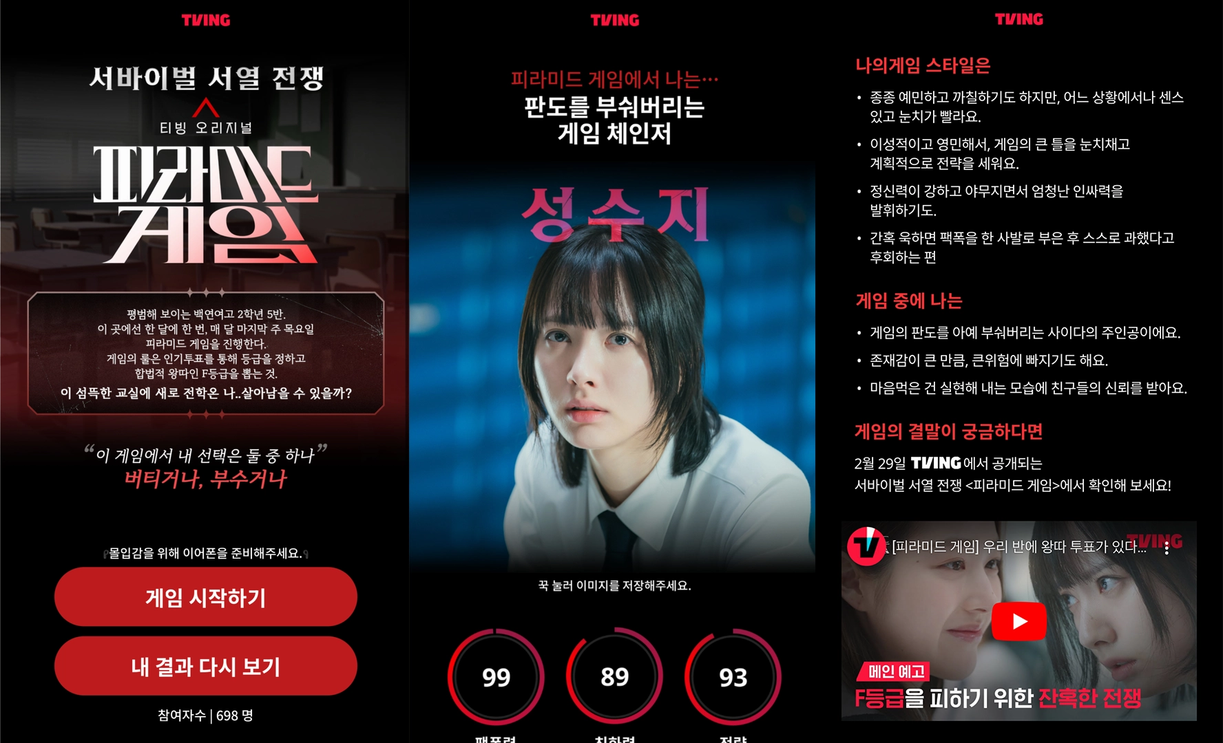 학교에서 벌어지는 서열 계급 전쟁이라는 후킹한 소재를 다루고 있어 충분히 주목을 받을 수 있어 보이지만, 티빙의 한나연 님께서는 이 피라미드 게임에 대한 전반적인 이해도를 높일 수 있는 방법을 먼저 강구하는 것이 우선이라 판단하셨다고 합니다. 게임에 직접 참여할 수 있도록 하여 참여도를 높이고 직접 게임을 체험할 수 있도록 해 콘텐츠를 향한 흥미를 높이는거죠!
