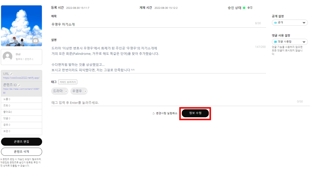 썸네일이 변경됐는지 다시 확인한 후, [정보 수정]을 클릭합니다.