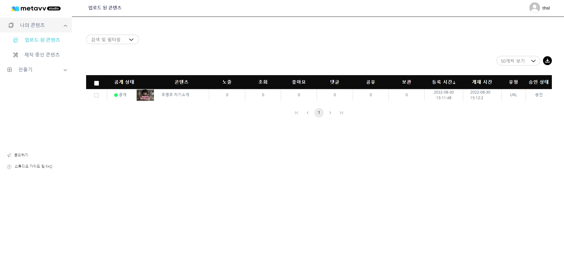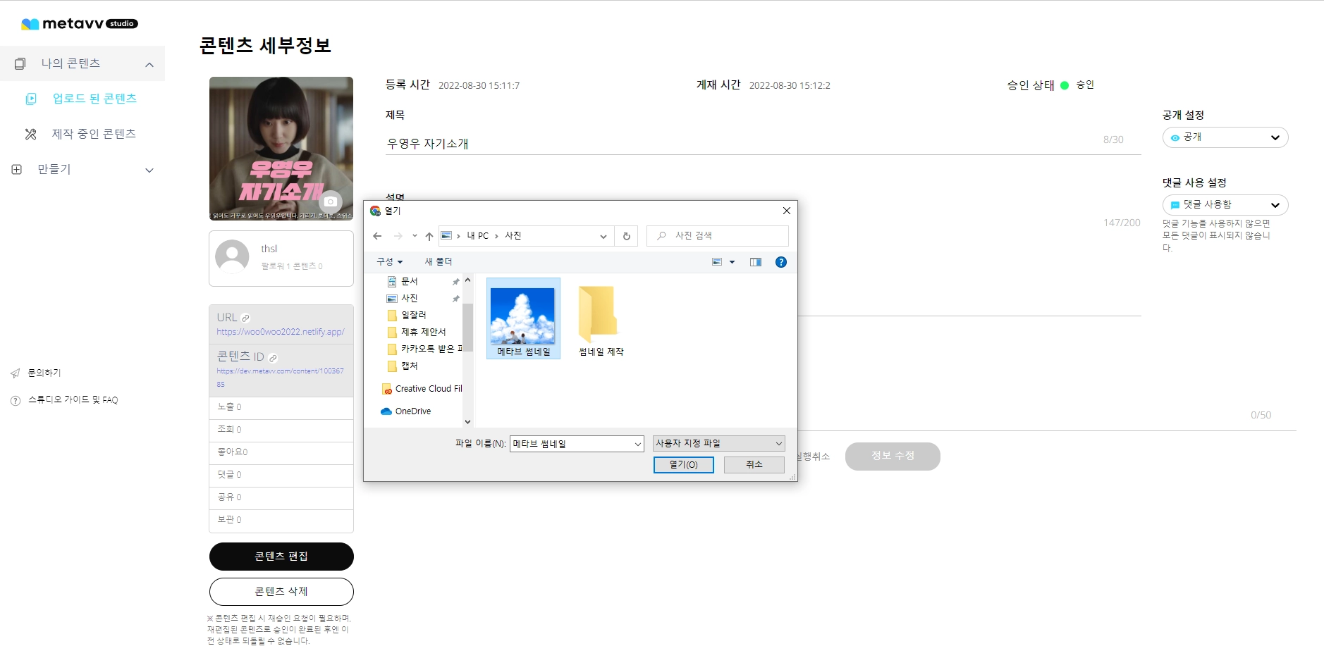 [나의 콘텐츠]-[업로드 된 콘텐츠]에서 승인된 콘텐츠의 제목을 클릭해 콘텐츠 세부정보 페이지로 이동합니다.